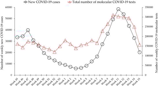Total number of COVID-19 molecular tests performed in Jordan compared to weekly newly diagnosed cases. Data were retrieved from Our World in Data (https://ourworldindata.org/coronavirus/country/jordan, acceesed on 23 April 2021).