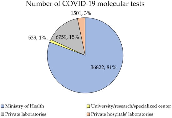 MoH laboratories contributed to the majority of COVID-19 molecular tests (n = 178,312, 79.1%), followed by private laboratories (n = 35,677, 15.8%; Figure 2).