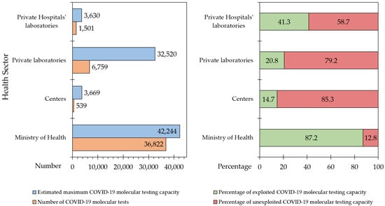 However, the deficit in exploitation of full testing capacity varied depending on the sector and location of the participating laboratories (Figure 3). MoH laboratories were operating at a level closer to their highest COVID-19 molecular testing capacity (36,822/42,244, 87.1%), compared to private hospital laboratories (1501/3630, 41.3%; p = 0.004), private laboratories (6759/32,520, 20.8%; p < 0.001), and finally university/research/specialized centers (539/3669, 14.7%; p < 0.001, ANOVA with Bonferroni correction for multiple comparisons).