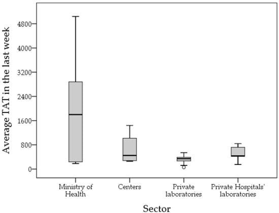 Multinomial logistic regression confirmed the lack of statistical significance for the comparisons in the paragraph above, with the location and health sector as covariates. This analysis was performed by dividing the TAT into two categories: the first for laboratories having a TAT less than 932 min, and the second for laboratories having a TAT of more than or equal to 932 min (the average TAT for the whole study sample).