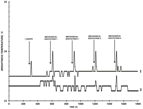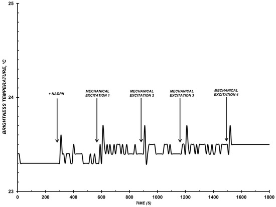 Pulse trains emerged with a delay after initiating the enzymatic reaction by adding NADPH (for approximately 500 s) and were observed after the mechanical excitation 2 at the 90th second (Figure 3). The total energy output of the radiation over the entire time of the observation was about 15.7 °C.