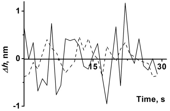 As is known, aggregates of CYP102A1 molecules are the most active functionally [28]. The heights of AFM images of both (WT) and (A264K) on mica amounted to 3.5 ± 0.3 nm. This is why, in our experiments, we studied the height fluctuations of CYP102A1—both (WT) and (A264K)—with (3.5 ± 0.1) nm height.