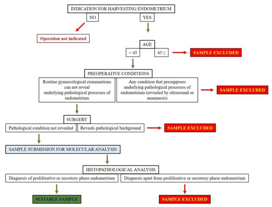 The aim of our present retrospective analysis was to determine what proportion of the surgically removed human eutopic samples are suitable as appropriate controls to reveal molecular alterations observed in ectopic tissues. This study covers the cases of a 3-year-long period and intends to reveal what the chances are that a healthy, surgically removed endometrial sample submitted to a laboratory is eligible to be processed for further in vitro experimental research. A list of 1162 final hospital reports and histopathology reports was examined where endometria have been submitted to histopathological analysis with an ICD code of irregular menstrual bleeding. This is one of the most commonly used codes submitted to the Pathology Departments together with endometrial samples. Altogether 949 operations were aimed at endometrial harvesting only. The remaining 213 cases were excluded, these being hysterectomy procedures or operations where endometrial harvesting was only a complementary part of another surgical procedure. In most cases, a hysterectomy is performed because of a confirmed pathological condition [9]. Hence, in the present research, only endometria extracted by scraping and biopsy procedures were examined. It has been described that in pathological endometria, numerous molecular alterations can be observed (e.g., in endometrial hyperplasia and tumors) [37,38,39,40]. For this reason, only healthy endometria can be an appropriate choice to examine molecular processes in a control experiment. In addition, it has been described that perimenopausal endometrium has altered gene expression compared to the premenopausal tissue [41]. Thus, as early menopause occurs at or before the age of 45 [42], every sample was excluded where the patient was older than 45 years.