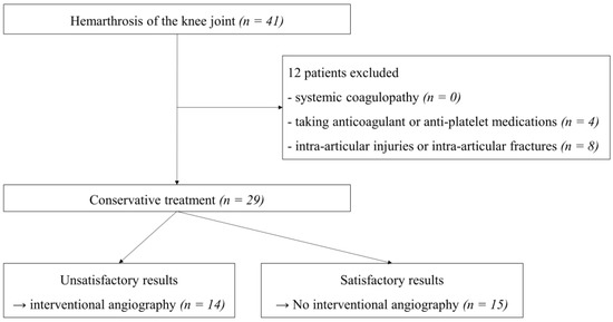 We classified patients into two groups: group A, consisting of 14 patients who did not obtain satisfactory results from conservative treatment and underwent interventional angiography and selective embolization, and group B consisting of 15 patients who obtained satisfactory results from conservative treatment (Figure 1). We compared the demographic information, serologic tests, aspirated synovial fluid analyses, and clinical outcomes of both groups and investigated interventional angiographic findings and procedures related to embolization in group A.