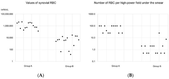 (A) Values of synovial red blood cells (RBCs) and (B) number of RBCs per high-power field under the smear of the synovial fluid smear. Group A: interventional angiography and selective embolization after failed conservative treatment. Group B: successful results after conservative treatment.