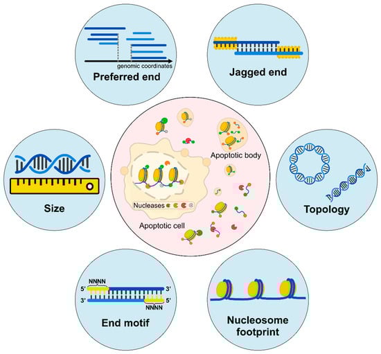 Biological characteristics of cell-free DNA. (Inner circle) Apoptotic cells would release DNA molecules into blood circulation accompanied by the digestion of intracellular Deoxyribonuclease 1 Like 3 (DNASE1L3), DNA Fragmentation Factor Subunit Beta (DFFB), and other nucleases. The released cfDNA molecules are further fragmented by extracellular DNASE1L3, Deoxyribonuclease 1 (DNASE1), and other nucleases. Different ends may represent characteristics of cleavages by various nucleases. (Outer circle) Fragment sizes are deduced by sequencing in single-base resolution; preferred ends are a subset of the genomic coordinates which are preferentially cleaved; jagged ends are single-stranded ends carried by these double-stranded DNA molecules; DNA topology consists of different forms of DNA molecules, including circular and linear forms; nucleosome footprints show different positioning varies among cell types; end motifs refer to several bases of characteristic sequences at the 5’ end of a fragment (e.g., the 4-nucleotide motif). All these characteristics are reflective of diverse fragmentation processes.