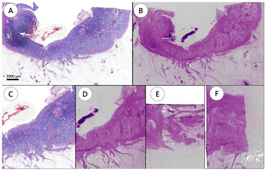 The extent of a tumor is a significant prognostic factor in colorectal cancer [27]. Neoadjuvant chemoradiotherapy for locally advanced rectal cancer is considered one of the standard treatments [13]. These cases often show fragments of residual disease or even eradicate the tumor in their resection specimens, in which thorough sectioning and careful examination to determine the correct tumor stage are required [28,29,30]. According to the results of our study, WBI successfully identified all tumor sites that were detected by WSI. Furthermore, WBI enabled evaluation of the distribution of tumors within the FFPE blocks, revealed the relationship of the tumors with surrounding LVI, PNI, or MLN, and eventually resulted in the change of the pathological diagnosis of TD which was diagnosed using WSI. Our study showed a 76.5% decrease in TD diagnosis after referring to 3D structures of WBI. TD is considered a significant adverse prognostic factor [31]. In addition, correction of TD diagnosis can be beneficial to tumors whose distance to the surgical margin should be measured with high precision. According to the current guidelines, CRM is considered positive when the measurement is ≤1 mm and suggests an increased risk of local recurrence, distance metastasis, and poor prognosis [32]. However, there is still an ongoing search for more implications, such as tumors ≤ 0.4 mm that may have a worse prognosis [33,34]. Although the difference in CRM between WBI and WSI was approximately 1 mm, our results showed that WBI significantly improved the cutting margin assessment compared with WSI.