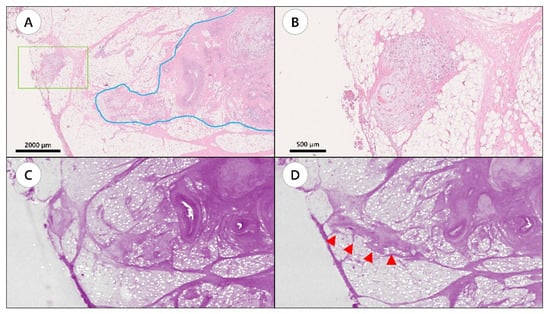For pathological review for WSI, whole-mount H&E glass slides were digitally scanned to create virtual slides using a NanoZoomer S60 (Hamamatsu Photonics, Hamamatsu, Japan) at 20× magnification (0.46 µm/pixel) [23,24]. WSI revealed the following findings: depth of tumor invasion, tumor deposit (TD), circumferential resection margin (CRM), benign lymph nodes (BLN), metastatic lymph nodes (MLN), lymphovascular invasion (LVI), and perineural invasion (PNI). The diagnoses of TD, LVI, and PNI were made according to the American Joint Committee on Cancer (AJCC) staging manual [25]. CRM was measured as the distance from the deepest part of the tumor to the inked soft-tissue edge [9].