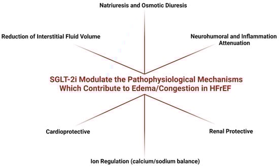 Summary of Mechanisms Contributing to Outcomes of SGLT-2i on Edema/Congestion in HFrEF [,,,,,,,,,,,,,,,,].