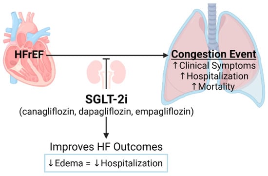 The aim of this review is to analyze the existing clinical data with the major focus on the potential of SGLT-2i in modulating or preventing fluid retention in patients at risk or active symptomatic HFrEF. Although edema/congestion is associated with poor HF outcomes, clinical diagnosis of edema is often limited to subjective patient symptoms and clinical signs from physical exam. Objective diagnostic imaging, laboratory tools and algorithms for assessment and early identification of edema are limited [,,,,,,,,,,,,,]. Limitations in the quantitative assessment of edema/congestion have hampered the evaluation of direct SGLT-2i edema-related outcomes in clinical studies and clinical trials.