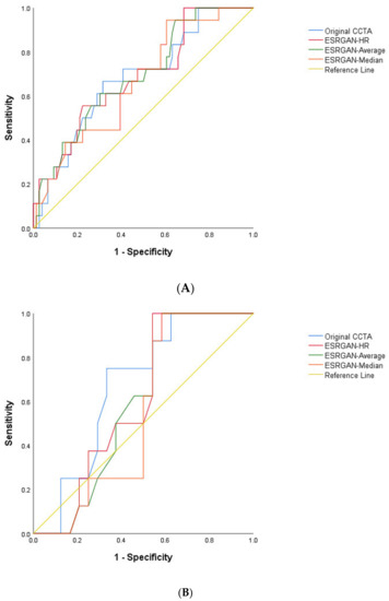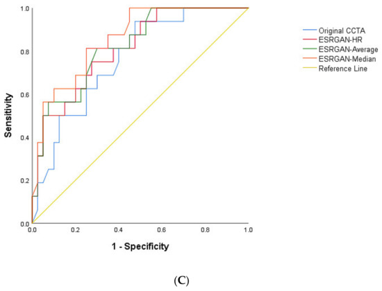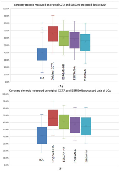 Besides, our results show that the ESRGAN-processed images reduced the false positive rates, thus improving the specificity and PPV when compared to the original CCTA images. Among the three different ESRGAN-processed datasets, ESRGAN-Median shows the best outcomes. It is well known that the average and median (pixel) binning are common image processing techniques to suppress the image noise, thus improving coronary lumen visualisation for more accurate assessment [21,22]. However, the blooming artifact in CCTA is due to averaging two extreme values of attenuations of a high-density calcified plaque and a much-lower-density vessel, and hence using the median as the resultant pixel value would be a better representation of the actual structure, leading to the most accurate assessment [5].