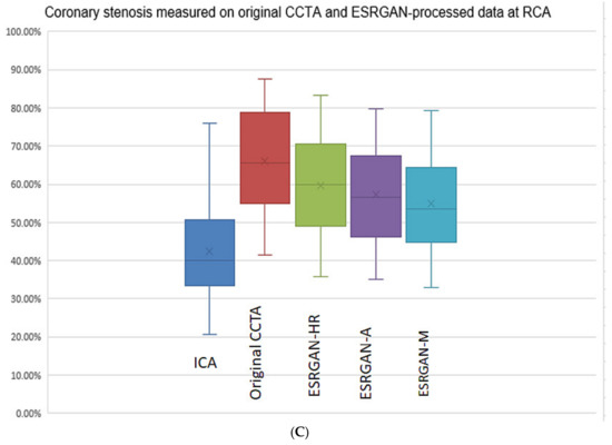Boxplot showing the comparison of degree of coronary stenosis at LAD, LCx and RCA between original CCTA and ESRGAN-processed data with invasive coronary angiography as the reference. Although original CCTA and ESRGAN-processed images significantly overestimated the lumen stenosis than ICA, ESRGAN-Median images show better improvement than ESRGAN-HR and Average at these three coronary arteries levels (A–C). A-average; CCTA-coronary computed tomography angiography; ESRGAN-enhanced super-resolution generative adversarial network; HR-high-resolution; ICA-invasive coronary angiography; LAD-left anterior descending; LCx-left circumflex; M-median; RCA-right coronary artery.