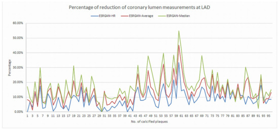 To study the impact of ESRGAN on reducing the blooming artifact with resultant improvement in coronary lumen visualisation and assessment, we also compared the percentage of reduction of MLD in these measurements by subtracting the MLD from original CCTA images to ESRGAN-processed images, with differences divided by the MLD from the original CCTA images. This allowed us to determine the diagnostic value of ESRGAN-processed images for assessment of calcified plaques, in particular the reduction of false-positive rates caused by severe calcification in the coronary arteries as opposed to those from the original CCTA images.