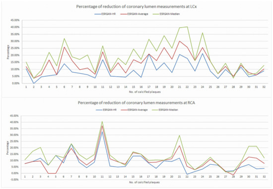 Graphs showing the comparison of measurement differences in coronary lumen stenosis between ESRGAN-processed and original CCTA images in terms of percentage reduction at LAD, LCx and RCA. ESRGAN-Median processed images lead to the highest reduction than the ESRGAN-HR and Average. CCTA-coronary computed tomography angiography; ESRGAN-enhanced super-resolution generative adversarial network; HR-high-resolution; LAD-left anterior descending; LCx-left circumflex; No.-number; RCA-right coronary artery.