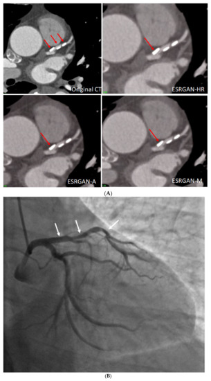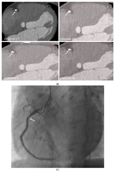 Recently, a study has reported the use of Canon AiCE reconstruction kernel to suppress the blooming artifact on the CCTA images. However, its findings show that the Canon AiCE reconstruction kernel could only achieve about 10% of PPV improvement for CCTA cases with 50% diameter stenosis or greater [38]. In contrast, our results (Table 2) illustrate that the use of ESRGAN could increase the specificity and PPV by at least 10% and up to 40%. Our superior results could be due to the use of the more recent DL method, GAN which was designed in 2014 while the Canon AiCE reconstruction kernel was developed based on the traditional method, CNN which emerged in 1980 [17,39]. For non-medical research, it has been demonstrated that GAN performs better than CNN for generating more realistic high-resolution images with unwanted noise removal which is essential for calcium deblooming [17,18]. Also, unlike the Canon AiCE reconstruction kernel which is vendor specific, our ESRGAN approach can be applied to any CCTA images [38].