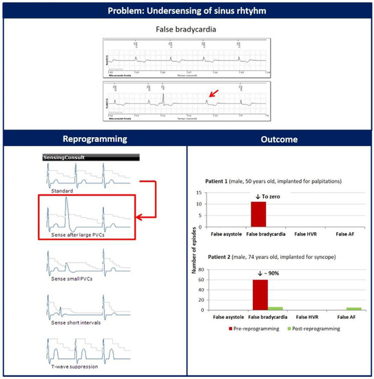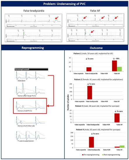 Red arrows indicate the undersensing of large, but low-amplitude premature ventricular contractions (PVCs). The reprogramming of the parameter ‘Sensing Consult’ from ‘Standard’ to ‘Sense small PVC’ significantly decreased the number of false bradycardia and atrial fibrillation episodes.
