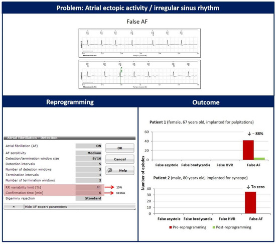 Three different sensing or detection problems were identified. In four patients, false bradycardia and AF alerts were caused by the undersensing of large premature ventricular contractions (PVCs) but with low amplitude, as shown in Figure 1. We modified the parameter ‘Sensing Consult’ from ‘Standard’ to ‘small PVC Sense’ in these patients. Basically, the latter configuration consists of a more aggressive decay of the dynamic sensing threshold after a sensed event to avoid undersensing of a close R-wave complex with lower amplitude. The following month, no further false bradycardia was observed compared to the 327 transmitted before programming optimization. In addition, false AF decreased significantly in 2 patients from 39 to 10 episodes, while the number of FPs did not decrease in one patient (12 vs. 29) due to persistent undersensing of PVCs.