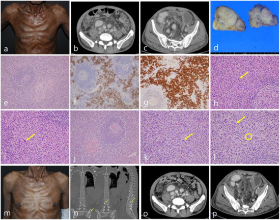 Tan-coloured skin developed gradually (a). Enlarged lymph node chains in right inguinal (b) and iliopelvic area (c) approximately 7 cm in CT scan. An excised inguinal lymph node showing vague fusion but complete encapsulation (d). Relatively atrophied germinal centre surrounded by concentrically arranged mantle zone with hyalinized vessels (e; H&E stain, ×100), which consists of both CD138 (f; CD138 IHC stain, ×200) and lambda light chain strongly positive (g; lambda IHC stain, ×200) plasma cells. Unignorable nuclear atypism of plasma cells (h,i; yellow arrow, H&E stain, ×400) making the neoplastic condition suspicious. Initial microscopic findings identical to those 8 years later, as described earlier (j; H&E stain, ×100) also demonstrating atypical plasma cells (k; yellow arrow, H&E stain, ×400) having the Dutcher body (l, yellow circle, H&E stain, ×400) Less-coloured skin (m), bone sclerotic lesions (n; yellow arrow), and dramatically disappeared lymph node chains (o,p) after Siltuximab administration.