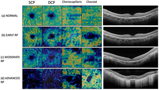 Vascular network differences between retinitis pigmentosa patients and a healthy subject in 3 mm × 3 mm OCTA scans at the (a) superficial capillary plexus (SCP), (b) deep capillary plexus (DCP), (c) choriocapillaris, and (d) choroid. In these angiograms, reduction in the vascular network density is recognizable. B-scan OCT images at different disease stages are shown on the right.