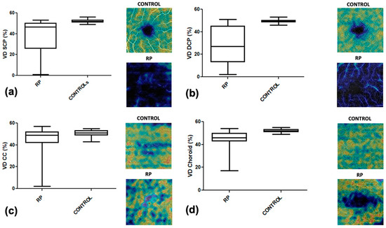 Box plots showing the relationship between controls and retinitis pigmentosa patients of the vascular density in the (a) superficial vascular plexus, (b) deep capillary plexus, (c) choriocapillaris, and (d) choroid. Statistically significant differences were observed at all layers.
