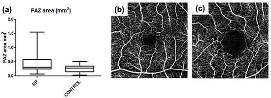 (a): Box plot showing the relationship between controls and retinitis pigmentosa patients, of the foveal avascular zone area. (b,c): Foveal avascular zone differences between two retinitis pigmentosa patients of different ages. The figures show the 3 mm × 3 mm OCTA of the superficial capillary plexus of two retinitis pigmentosa patients of 12-year-old (b) and 59-year-old (c), respectively. The foveal avascular zone enlargement is evident in the older patient.