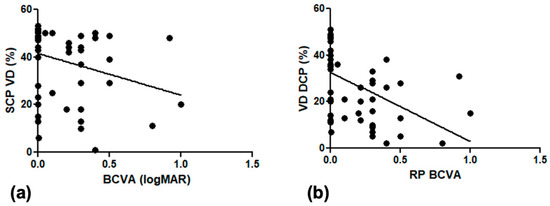Scatterplots showing the relationship between vascular density in superficial capillary plexus (a) and deep capillary plexus (b) and best-corrected visual acuity (BCVA), expressed in LogMAR, in retinitis pigmentosa patients.