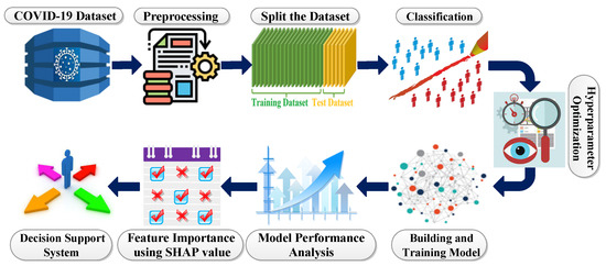 Rajaraman and Antani [11] developed a deep-learning framework for COVID-19 detection using chest X-ray (CXR) data collected from COVID-affected people and then analyzed it using a convolution neural network (CNN) to evaluate the system. Yan et al. [12] proposed a model to detect severely affected COVID-19 patients using three clinical attributes and an ML algorithm. They used eXtreme gradient boosting (XGB) to predict their model. Another framework using ML and inpatient facility data for early detection of COVID-19 was presented by Awal et al. [13]. Here, Bayesian optimization was used to select optimal hyperparameters of the ML algorithms, and the adaptive synthetic (ADASYN) algorithm was applied to balance the dataset. The model showed 98.50% ACC using the XGB classifier. Here, the important features were also estimated using SHAP analysis, and a graphic interface was also presented for supporting medical staff. Kassania et al. [14] developed an ML-based COVID-19 detection system using CXR images where they applied a deep CNN to extract essential features. Two deep-learning techniques named DenseNet121 and ResNet50 were used for classification, and their accuracy was 99% and 98%, respectively. On the other hand, Saha et al. [15] proposed an automated diagnosis system for COVID-19 using CXR based on the ensemble method and CNN. Deep features extracted using CNN were utilized to combine four binary classifiers: support vector machine, random forest, AdaBoost and decision tree. Thus, they were able to build an ensemble of classifiers for better detection of COVID-19. The system showed better performance with 98.91% ACC. Rasheed et al. [16] presented the COVID-19 diagnosis system from a chest X-ray image using logistic regression (LR) and CNN. A principal component analysis (PCA) was used to reduce the dimension that increases the speed of the learning process. The CNN and LR showed 95.2–97.6% ACC without using PCA, whereas 97.6–100% ACC was obtained with PCA for COVID-19 detection.