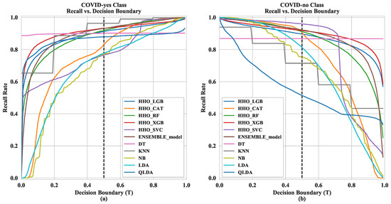 The recall rate has been enumerated in our proposed classification task depending on a fixed threshold (T). To exemplify, in Figure 4, 0.5 threshold value for “COVID-yes” class has been considered to demystify the relationship between the recall rate (displayed along the y-axis) and the decision boundary (visualized along the x-axis), where the best recall rate has been obtained from the KNN provided, 0.9268, implying that approximately 92.68% of the time, KNN accurately classifies the “COVID-yes” class, whereas HHOXGB correctly classifies the recall rate for “COVID-no”.