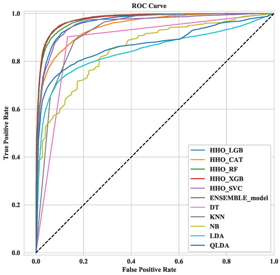 The probability/performance of a binary outcome while classifying or predicting is defined as the ROC curve. The graphical representation of the ROC curve in Figure 5 shows that the ACC of the ensemble method grabs the apex in terms of ACC, whereas the LDA remains at the lowest point.