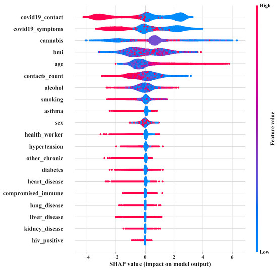 The significance of the features for any classification or prediction can be effortlessly analyzed by sorting the features in plunging mode, where the most influential feature occupies the peak point. For instance, as manifested in Figure 6, the bar plot visualizes the top 20 features, where “COVID19_contact” is in the topmost position. The next dominating features are “COVID19_symptoms”, “cannabis”, “bmi”, “age”, “contact_counts”, etc. In contrast, “hiv_positive” remains undersurface compared to the other features exhibited in the given diagram. Moreover, from Figure 6, it can be seen that higher “COVID-19_contact”, “COVID19_symptom”and “health workers” show a negative SHAP value, i.e., negative correlation. It intuitively reveals that the higher values of this feature indicate less chance to survive, i.e., COVID-no in this case and vice versa. Note that the summary plot is a bird’s eye view of the data. The SHAP dependence plot and SHAP feature interaction plot can be used to discuss a particular feature and particular instance. This may determine the effect of one specific feature in model performance improvement, which is beyond the scope of this paper, and we will keep it in our near future works.