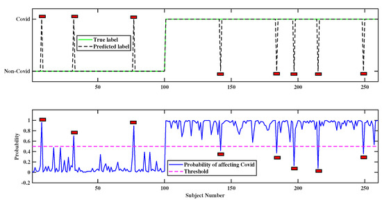 Note that the threshold value of 0.5, i.e., probability = 0.5, has been considered according to the general rule of machine learning. If the threshold value is less than or greater than 0.5, then there may arise Type-1 and Type-2 errors. Moreover, probability = 0.5 is the middle point between 0 and 1, which provides a balanced and unbiased calculation of sensitivity, specificity and other performance metrics. If the probability calculated by the ensemble method is greater than 0.5, it represents that a patient would have a higher chance of “COVID-yes”. This graphical representation will benefit nonspecialist users such as clinical staff and nurses. The previously calculated probability from the ensemble method has been exercised to visualize an expected output of “COVID-yes” as represented in Figure 7. It is worth noting that in the upper figure in our predicted label is highly accurate to the true label except for the specific patient (marked by the red rectangle in Figure 7). Moreover, the corresponding probability of “COVID-yes” has been shown in the lower figure. The test data are sorted in escalating mode to initially visualize the “COVID-no” class and then the “COVID-yes” class.