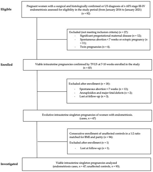 Pregnant women with no evidence of the disease (no previous diagnosis of endometriosis, availability of a normal transvaginal US before pregnancy and a negative history of dysmenorrhea, deep dyspareunia and/or chronic severe pelvic pain) were randomly enrolled as controls in a 1:2 match. Matching of cases to controls was achieved by enrolling the first two pregnancies with no evidence of endometriosis, with identical parity and body mass index (BMI) similarity (±1 unit), observed within 5 days from recruitment of each case with endometriosis. The patient selection process is shown in Figure 1.