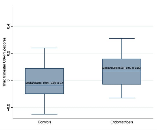 Box plots of third trimester UtA-PI Z-scores in endometriosis patients and controls weighted for the predictors included in the multivariable model are shown in Figure 2.