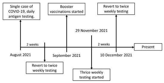 Our laboratory has 161 staff members. As part of routine rostered testing, all staff has been tested with twice-weekly rapid antigen testing. In August 2021, one of our staff members (immunized with 2 doses of Pfizer BNT162b2 mRNA vaccine) developed COVID-19 symptoms and tested positive for SARS-CoV-2 on RT-PCR. Subsequently, all staff members underwent immediate RT-PCR testing every three days (Roche SARS-CoV-2 qualitative assay on the Cobas 6800), and rapid antigen testing (Standard Q, SD Biosensor and Abbott Panbio COVID-19 Ag Rapid Nasal Test Device) every day for the next two weeks as previously reported [13]. As no new cases were detected, RT-PCR testing was discontinued, and all staff reverted to rapid antigen testing twice a week until the end of November 2021. With an increasing number of COVID-19 cases in our hospital staff, regular screening with rapid antigen tests was increased to three times a week in the hope of improving detection rates. This regimen was applied until the 10th of December 2021. We since reverted to twice-weekly testing until present (the timeline is displayed in Figure 1). Booster shots of the Pfizer mRNA were administered to staff from the end of September 2021 onwards. Over the entire period (August 2021 to the present), none of our staff tested positive for SARS-CoV-2 with either twice- or thrice-weekly antigen testing.