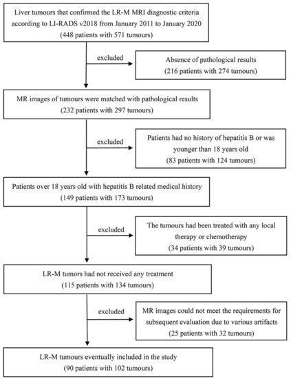 This retrospective study was approved by the Medical Ethics Committee, and the requirement to obtain written informed consent was waived. To ensure that patients were eligible for this study, two radiologists evaluated liver tumours that confirmed the LR-M MRI diagnostic criteria from picture archiving and communication systems according to LI-RADS v2018 from January 2011 to January 2020. The inclusion criteria were as follows: (1) patients with chronic hepatitis B virus infection via laboratory tests; (2) liver cirrhosis confirmed by pathological examination via liver biopsy or surgery; and (3) pathological results of the tumours obtained through puncture or surgery within one month after MR examination. Patients with liver cirrhosis younger than 18 years, congenital or vascular-related cirrhosis, and who received any treatment for liver tumours were excluded. For patients with multiple lesions, the target lesions matched the surgically resected lesions, and the pathological results were selected for analysis. Any discrepancies in the results were resolved by consensus between the two observers. Finally, a total of 90 patients with 102 tumours were included in this study (Figure 1).