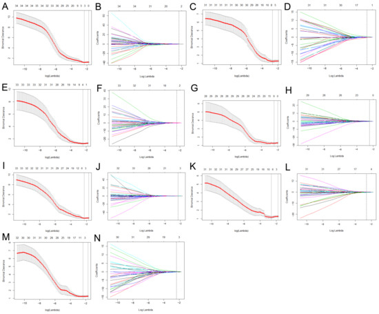 Feature selection using LASSO logistic regression of T2WI (A,B), AP (C,D), PVP (E,F), T2WI + AP (G,H), T2WI + PVP (I,J), AP + PVP (K,L), and T2WI + AP + PVP (M,N) imaging. The LASSO binary logistic regression model was used to select features and the regularisation parameter (λ) of the LASSO was used to perform 10-fold cross-validation (A,C,E,G,I,K,M). The coefficients were plotted against the log (λ) sequence, and the vertical line was drawn at the value selected using 10-fold cross-validation in the ln(lamda) sequence, nonzero coefficients were selected finally (B,D,F,H,J,L,N). LASSO, least absolute shrinkage and selection operator.