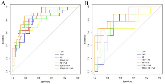 Stepwise logistic regression analysis was used to construct a radiomics model to identify HCC and non-HCC and included T2WI, AP, PVP, and the corresponding combined models. The model was further validated in the validation cohort. Simultaneously, receiver operating characteristic (ROC) curves were generated to evaluate the performance of two radiologists (junior and senior radiologists) and various targetoid masses (rim APHE, peripheral “washout,” and delayed central enhancement) in distinguishing HCC and non-HCC. The discriminative performance of the radiologists, targetoid masses, and different models was compared using the DeLong test.