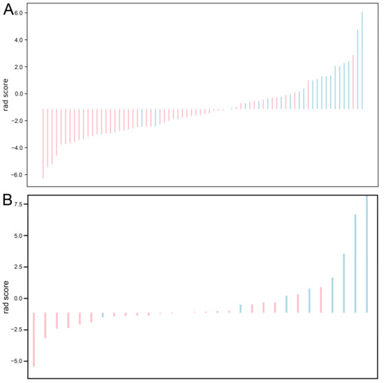 Seven models were established: T2WI, AP, PVP, T2WI + AP, T2WI + PVP, AP + PVP, and T2WI + AP + PVP. The ROC curves of each radiomics model in the training cohort and validation cohort are shown in Figure 4A,B. Among these models, the combined model based on T2WI + AP + PVP showed the best performance. No difference was detected between the training cohort and validation cohort (p > 0.05; Delong test) (Table 3). Each tumour’s rad-score in the training cohort and validation cohort is shown in Figure 5.