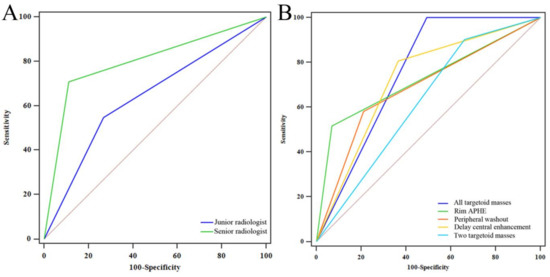 Comparison of the receiver operating characteristic curves of junior and senior radiologists (A) and each targetoid mass (B).