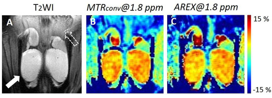 Figure 1 depicts the representative in vivo Cr-CEST images of the mouse testes. In the MTR asymmetry map at 1.8 ppm, the testes displayed a higher MTR value than other tissues (Figure 1B,C). There was no visible difference between the MTR value of MTRconv and that of AREX in the testes. However, the MTR value of AREX was lower than that of MTRconv in the testicular epithelium. Figure 2 depicts the difference in the MTR asymmetry value at 1.8 ppm between the testis and testicular epithelium. The ΔMTR asymmetry of AREX was significantly larger than MTRconv (MTRconv: 11.0 ± 2.0 vs. AREX: 15.6 ± 3.5; p < 0.001).