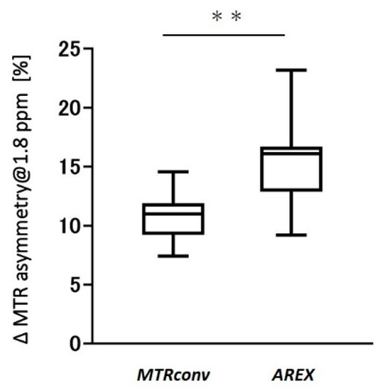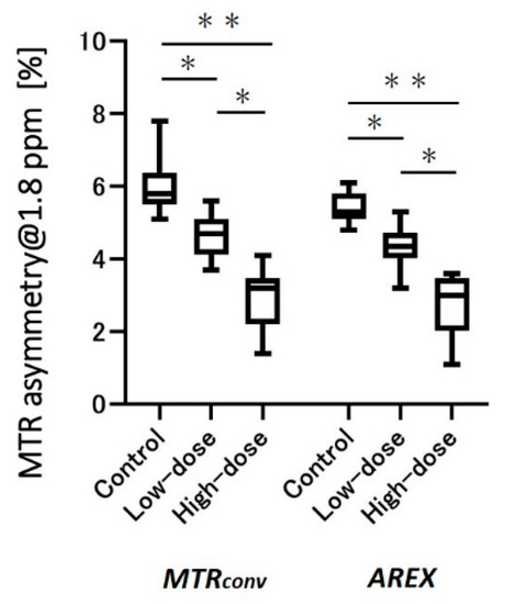 The MTR asymmetry values are presented as mean values ± standard deviation (SD). We performed a Wilcoxon’s test to compare the differences between the two groups (MTRconv vs. AREX) using Prism 8 (version 8, GraphPad Software, San Diego, CA, USA). The differences between the three groups (control, low-dose and high-dose) were analyzed using the Kruskal–Wallis test. Differences were considered statistically significant at p-value < 0.05. The notations for significant differences in the graphs of results are defined as follows: * p < 0.05 and ** p < 0.01.