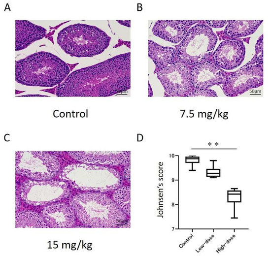 Figure 4 represents the histopathological analysis of the testes in the control and cisplatin-treated mice. We observed spermatogenesis dysfunction in both the low- and high-dose cisplatin-treated models (Figure 5A–C). The Johnsen score for the high-dose group was significantly lower than that for the control (Figure 5D; control: 9.8 ± 0.2 vs. high-dose: 8.3 ± 0.4, p < 0.001), whereas there was no significant difference in the low-dose group (low-dose: 9.3 ± 0.2).