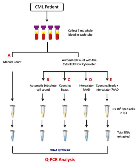 Workflow of the study. A total of 28 mL of peripheral blood from CML patients was collected within a single blood draw, in sterile 4 × 7 mL EDTA tubes. Total white blood cells (WBC) were isolated using the Biomek i-5 Automated Workstations and re-suspended in phosphate buffered saline (PBS). Next, a count was carried out by the manual (A) and the automatic methods via the CytoFLEX instrument (B–E). In the manual methods, samples were diluted and counted using the hemocytometer counting-chamber with a microscope. In the automatic method, four different measurements were tested: the automatic absolute protocol, the automatic assay using counting beads, the automatic protocol with 7-Aminoactinomycin Dye (7AAD) solution, and the automatic method based on the use of either counting beads and 7AAD. Next, 1 × 107 of the collected cells were lysed in RLT buffer and total RNA was isolated from matched samples. Finally, quantitative polymerase chain reaction (Q-PCR) was used to measure BCR-ABL1 and ABL1 gene transcript levels. EDTA tube: EthylenDiaminoTetracetyc Acid tube; RNA: RiboNucleic Acid; Q-PCR: quantitative polymerase chain reaction; cDNA: complementary DeossiNucleic Acid.