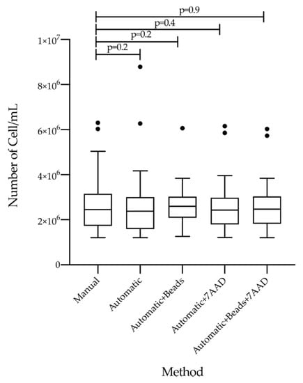 In order to compare the count methods efficiency of the five measurements, we evaluated the count of WBCs using Manual, Automatic, Automatic + Beads, Automatic + 7AAD and Automatic + Beads + 7AAD methods (Figure 2). We observed comparable count efficiency between the methods and, interestingly, no statistical differences were observed between the five counting assays (Figure 2). The median of counted cells was 2.46 × 106 (range 1.20 × 106–6.30 × 106) with the Manual protocol, 2.46 × 106 (range 1.20 × 106–6.27 × 106) with the Automatic method, 2.60 × 106 (range 1.26 × 106–6.06 × 106) when we measured the cells with Automatic and Beads measurement, 2.43 × 106 (range 1.22 × 106–6.16 × 106) when we used the fluorescent intercalator 7-AAD solution and, finally, 2.47 × 106 (range 1.20 × 106–6.04 × 106) when we combined Automatic count plus Beads and 7AAD solution (Table 2, cell isolation).