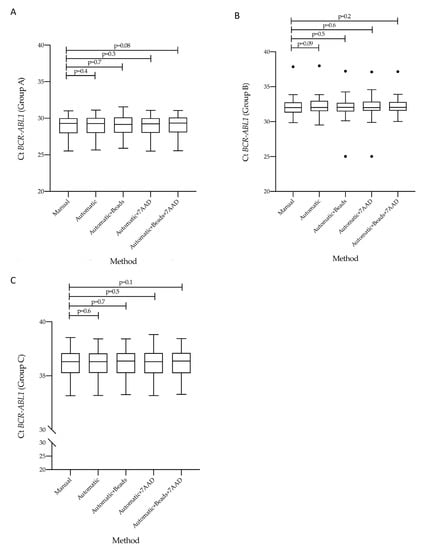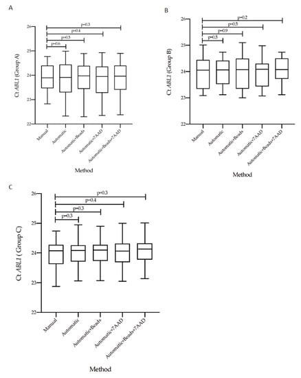 Previous evidence has established that the measurement of BCR-ABL1/ABL1IS transcript levels may be affected by the accuracy of the method used [21,24]. Variables of different procedures may result in different molecular response scoring for CML patients. The choose of counting method is crucial to obtain high-quality and reproducible data. To this purpose, we stratified the CML patients according to their BCR-ABL1/ABL1IS transcript level into three groups (Group A, B and C) and then we compared Ct value obtained from matched specimens counted by the five different methods. By considering the BCR-ABL1 Q-PCR data, we found similar Ct values in all investigated groups. Specifically, we observed that in Group A the Ct value median was 29.30 (range 25.52–31.01) for samples counted by hemocytometer counting-chamber, 29.28 (range 25.66–31.10) for the automatic method, 29.37 (range 25.89–31.55) using counting beads, 29.24 (range 25.50–31.08) adding only the intercalator 7AAD and 29.34 (range 25.56–31.06) combining the counting beads with 7AAD solution (Figure 3A). When we looked at Group B, we detected a Ct value median of 32.01 (range 29.85–37.85) in the manual method, 32.03 (range 29.53–37.99) in automatic measurement, 32.10 (range 30.12–37.22) in presence of counting beads, 32.04 (range 29.89–37.10) using 7AAD solution and 32.05 (range 30.02–37.15) in the combined assay (Figure 3B). In the last Group (C), we observed a Ct value median of 36.30 (range 33.16–38.55) by manual count, 36.31 (range 33.18–38.42) in the automatic method, 36.36 (range 33.26–38.42) with counting beads, 36.30 (range 33.17–38.82) in presence of 7AAD solution and 36.36 (range 33.28–38.44) using counting beads plus the intercalator 7AAD (Figure 3C).