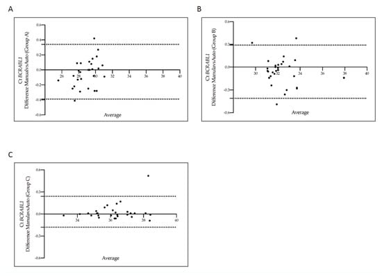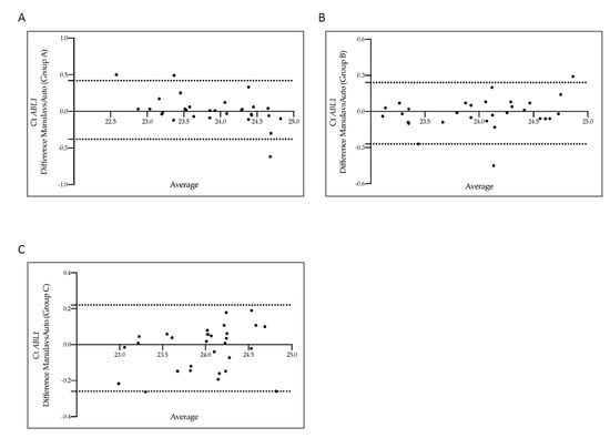 Bland–Altman showing the concordance of the ABL1 Cycle threshold values measured in matched samples counted by the manual and the automatic absolute cell-counting assays. Paired measurements of ABL1 Ct value were combined for patients stratified into three groups, each consisting of 30 individuals: Group A (10% > BCR-ABL1/ABL1IS > 1%) (A), Group B (1% > BCR-ABL1/ABL1IS > 0.1%) (B), and Group C (0.1% > BCR-ABL1/ABL1IS > 0.01%) (C). The graph is plotted on the XY axis where X depicts the difference of the two measurements, and the Y-axis shows the mean of the two measurements. Horizontal lines are drawn at the mean difference between the two counting methods and the upper and lower limits of agreement. The 95% confidence intervals are shown for the mean and the upper and lower limits of agreement.