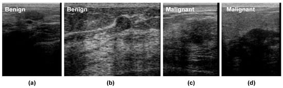 Examples of BUS images for (a,b) benign and (c,d) malignant cases. They show the presence of artifacts such as speckle noise and the hypoechoic region with shadows caused by the reflection of a high quantity of energy by an enormous impedance discontinuity and a variety of breast tumor shapes and sizes.