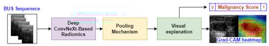 Figure 2 presents an overview of the proposed approach for predicting breast cancer malignancy from BUS images. As shown, the proposed method comprises three main components: (1) an emerging deep learning network called ConvNeXt [15] to extract robust radiomic features, (2) a pooling mechanism to generate the malignancy score of each input BUS sequence, and (3) a visual explanation algorithm to help interpret deep learning decisions. Three components of the proposed method are illustrated below in detail.