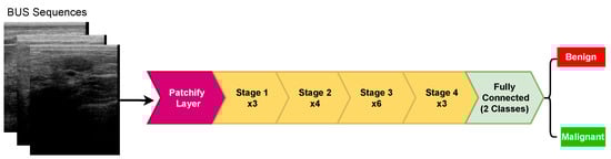We employed ConvNeXt [15] to extract robust radiomic features to classify breast cancer tumors as benign or malignant. In ConvNeXt, the architecture of the standard CNNs is modernized to the construction of a hierarchical vision transformer. As discussed in [15], the starting point of ConvNeXt is a ResNet-50 [12] model, which has four stages, each containing several blocks. In ConvNeXt, the ResNet-50 model has been trained with similar training techniques used to train vision transformers. As shown in Figure 3, ConvNeXt is a multistage design with varying feature map resolutions for each stage, in which the stage-compute-ratio—SCR (number of blocks per stage)—and stem cell structure are the two design concerns. ConvNeXt has four stages, where the SCR is set to (3, 4, 6, 3). ConvNeXt employs a patchify layer implemented using a , stride 4 convolutional layer. The patchify layer is a distinct difference between ConvNeXt and ResNet (and CNNs in general), which uses a stem cell comprising a convolution layer with stride 2, followed by a max-pool.