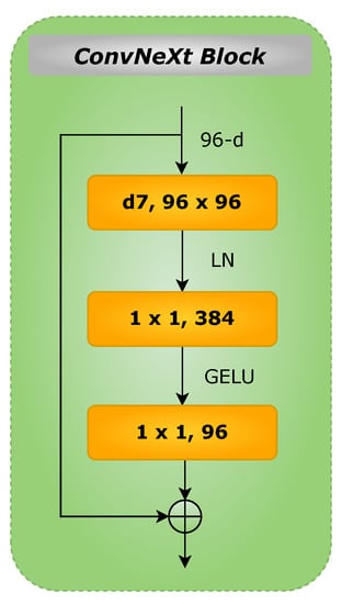 Figure 4 depicts the schematic diagram of ConvNeXt block. As shown, the block contains a depthwise convolution, two layers, and a nonlinear GELU activation (gaussian error linear unit, a smoother variant of ReLU). Layer normalization (LayerNorm) is used before the Conv layer. For an input z, GELU can be expressed as follows [24]: